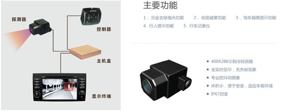 夜間可視有效距離是燈光的三倍,以上寬闊的視場和優(yōu)秀的熱成像特性為駕駛者提供清晰可見的圖像,大大提高了夜間駕駛的安全性。 熱像儀探頭可安裝在進(jìn)氣口前端位置,是內(nèi)置式設(shè)計,具有去強(qiáng)光、破霧、駕車偏離提示、行人提示、行車記錄儀等功能,并具有體積小、重量輕,安裝簡便等特點(diǎn),可以安裝在多種車型上。