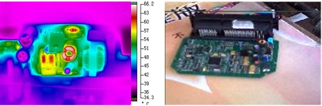 能源供給汽車(chē)的電器主要以直流電壓、電流為主,而且功耗較小,但利用還是可以利用熱像儀檢測(cè)電路元器件(如功率管、ECU芯片等)溫度、電路板溫度分布、其他系統(tǒng)部件(如蓄電池、發(fā)電機(jī)、直流電機(jī)、線(xiàn)圈、保險(xiǎn)絲等)溫度、電氣線(xiàn)束的溫度及各個(gè)電氣接點(diǎn)的溫度,利用所獲的溫度信息可診斷相關(guān)系統(tǒng)是否出現(xiàn)故障或發(fā)生異常。
