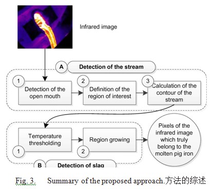這個(gè)方法是利用在紅外圖像中出現(xiàn)的明顯溫差把鐵水從熔渣中區(qū)分開(kāi)。此方法是隨著區(qū)域增長(zhǎng)的一個(gè)溫度闕值法。