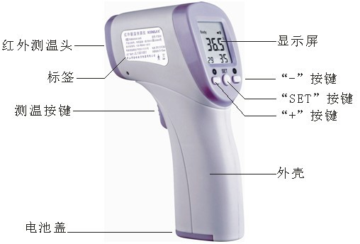 該測溫儀是專為無需接觸人體而設(shè)計的,測量人體身體額頭及體表溫度的體溫計。